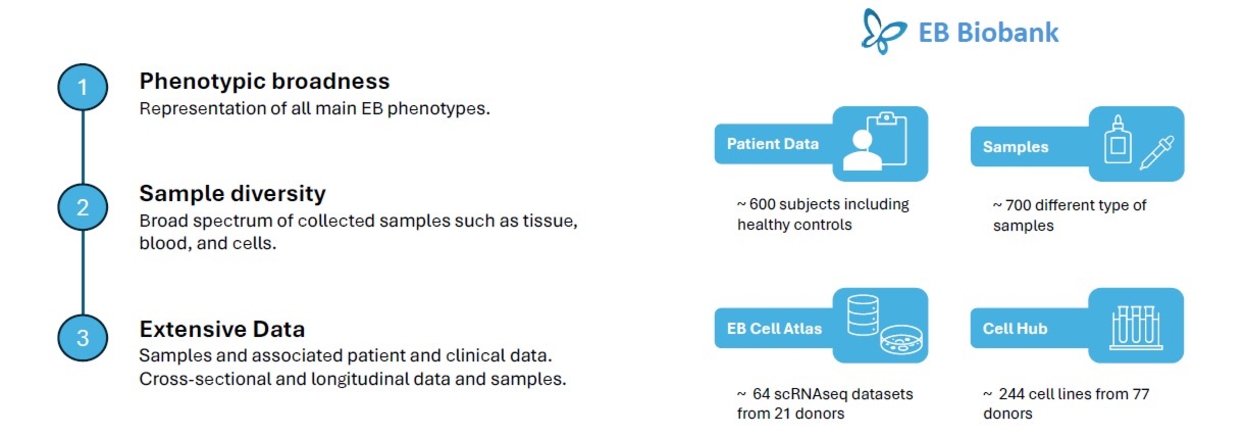 EB Biobank is an infrastructure project under EB Research Institute. We systemically collect and process biological samples and related donor data with a focus on EB patients. Existing sample diversity and detailed patient data with scRNAseq data allows us to yield unprecedented insight into pathogenic events especially for rare diseases.