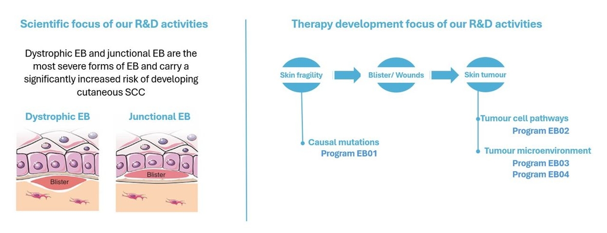 Current scientific focus of our R&D activities lies in addressing dystrophic and junctional EB. These are the most severe forms of EB and carry a significantly increased risk of developing cutaneous squamous cell carcinoma (SCC).